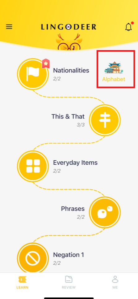 I started by heading to the LEARN tab and tapping the “Alphabet” icon at the top right corner.