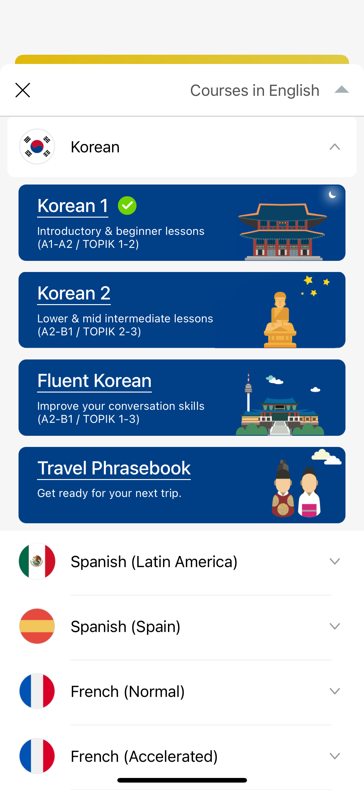There are also some great supplemental materials in the app. If you’re at a more advanced level, you can check out short conversations in the “Fluent Korean” section. Plus, the Travel Phrases section is like a mini handbook for your trips to Korea! While I haven’t fully explored these yet, I’m excited to check them out as my Korean improves.