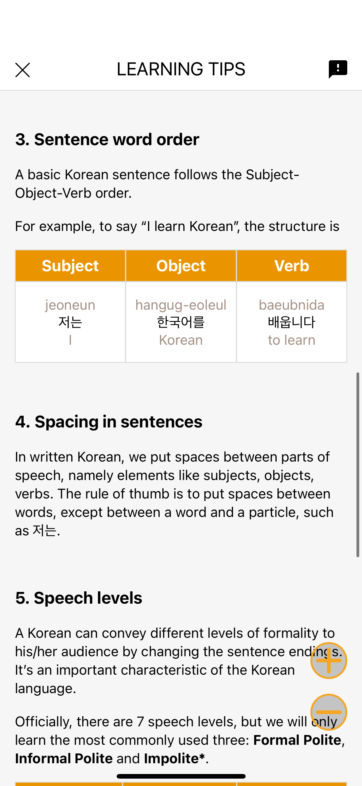 Before diving into the Korean lessons, I strongly recommend you checking out the Learning Tips. This is like a little notebook helping you organize the key points in the course. The detailed explanations helped me grasp the basics of Korean even as a complete beginner. I even took notes on paper as the lessons got more complex!